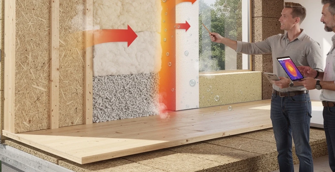 La densité des matériaux naturels influence directement leurs propriétés thermiques. Les isolants denses comme la fibre de bois offrent une excellente inertie thermique, permettant un déphasage important qui améliore le confort d’été. Cette caractéristique distingue fondamentalement les isolants naturels des solutions synthétiques, car ils stockent et restituent la chaleur de manière progressive, créant un tampon thermique naturel dans l’enveloppe du bâtiment.